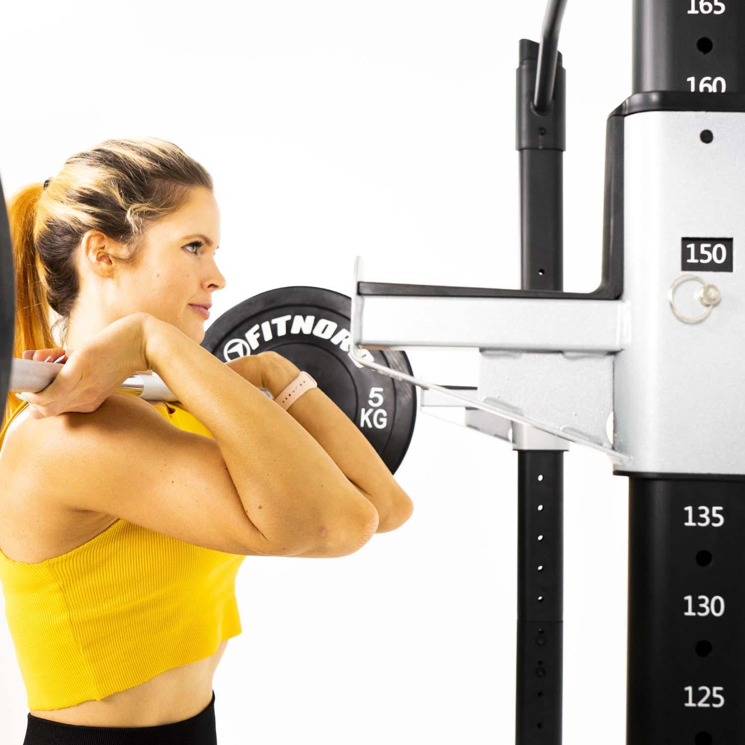 FitNords mångsidiga halvställ innehåller fyra hållare och en chin-up-stång. Dem egna viktplattorna kan förvaras enkelt med de avsedda hållarna och stången ligger stadigt på dem avsedda hållarna. Stånghållarna kan ställas in i många olika höjder för både knäböjsträning och bänkpress. Ställningens ben är rejäla och har halkfria sulor, men den är också enkel att fästa i golvet om du behöver extra stöd för olika rörelser. Den kompakta squat buren är mycket lämplig även för ett litet träningsutrymme och den starka stålkonstruktionen gör Half Rack säker att använda.